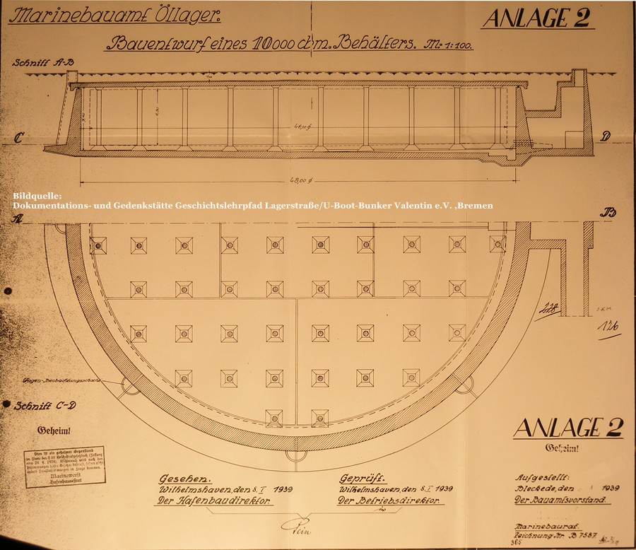 Die nachfolgende Planskizze, die das Bauprinzip dieser Öl-Tanks zeigt, wurde 1939 in Bleckede, für die geplante Tankanlage in Bremen Farge angefertigt.