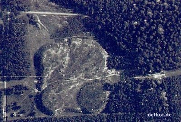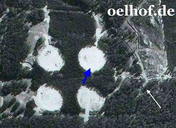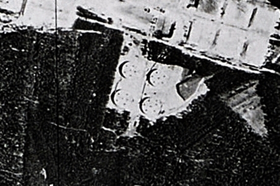 Bild 6 wurde am 29 Oktober 1944 aufgenommen. (Britische Luftaufklärung) Obwohl die Tank-Gruppe mit Sand überdeckt wurde und bereits Bäume zur Tarnung gepflanzt waren sind Radien der Tankbunker deutlich abgebildet. Die Bilder 6 und 7 sind hier, gegenüber dem Bild im Kopf der Seite, um 90° gedreht dargestellt. Bei der damals schon bestehenden Fotoqualität erübrigt sich die Frage nach der Qualität der Tarnung der Anlage im Wald bei Bleckede.