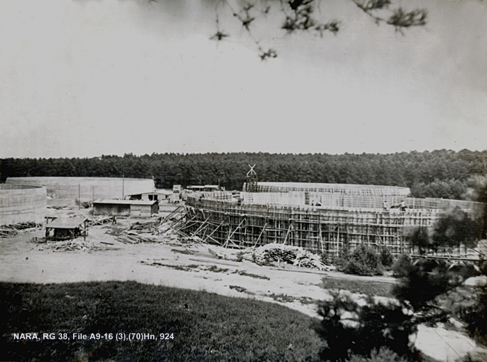 Die Behälter dieser Tank-Gruppe wurden nahezu ebenerdig errichtet und anschließend mit Boden abgedeckt. Dadurch entstand eine ausgeprägte Böschung, die auch auf den Luftbildern deutlich zu erkennen ist. Das Bild 3 wurde bei den Bauarbeiten aus westlicher Richtung aufgenommen. Die vier Rundtanks befinden sich in unterschiedlichen Bauphasen. Bei den Bauarbeiten kam es, bei einem der vier Tanks am 21. November 1937, zu einem Einsturz der Decke. Bei diesem Unfall wurde ein Arbeiter getötet. Detaillierte Informationen über den Hergang dieses Ereignisses sind bisher nicht bekannt [34].