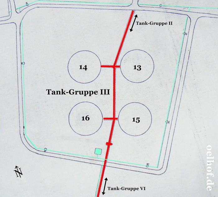 Neben der Gruppe III befand sich eine Zisterne für Löschwasser (weißer Pfeil). Neben der Zisterne befand sich hier ein Verteilerschacht für die Ölleitung zur Tank-Gruppe VI.