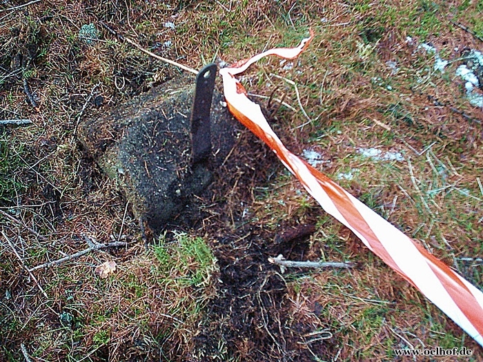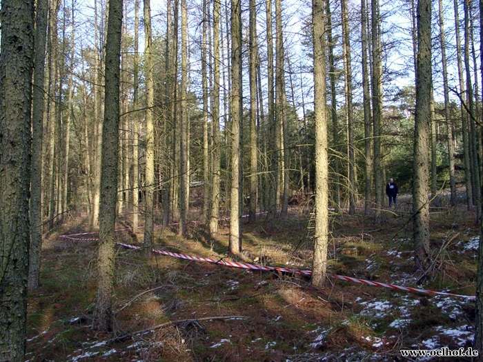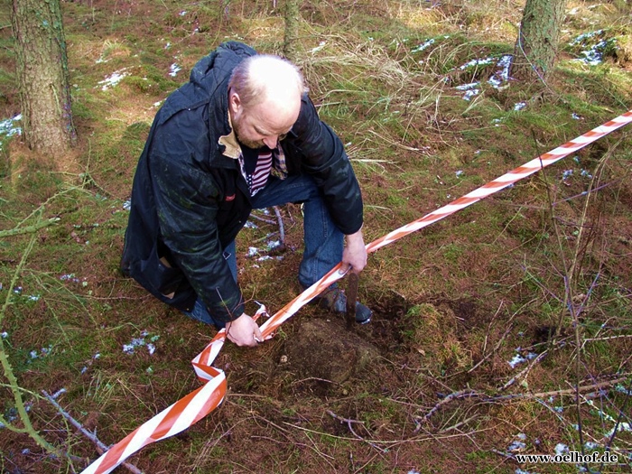 Bei der Freilegung der einzelnen Fundament-Blöcke im Jahr 2003 konnten die beiden Gebäude nicht zweifelsfrei voneinander unterschieden werden. Teilweise wurden die Fundamentblöcke „wegplaniert“ damit waren Gebäudefluchten nicht eindeutig auszumachen. Wir beschränkten uns auf eine, eher grobe, Markierung der gefundenen Umrisse für das nachfolgende Foto.