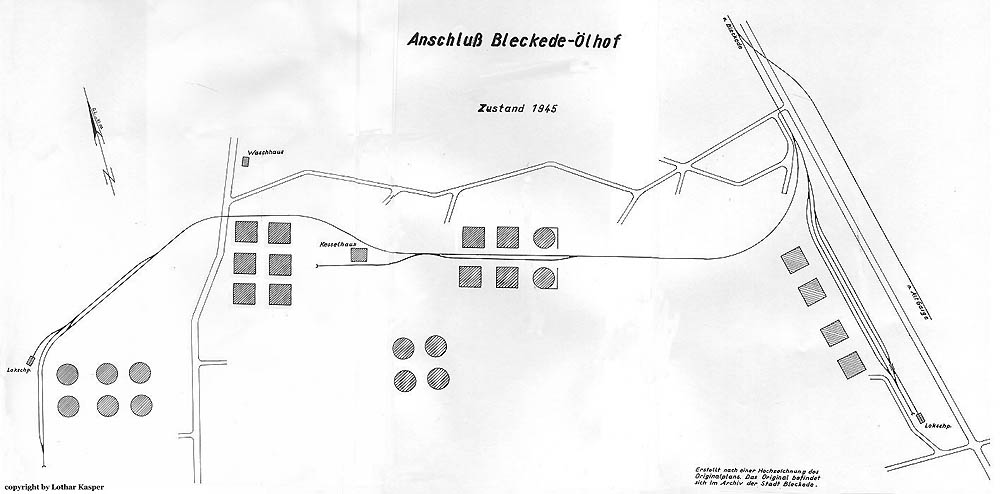 Im Bild 3 ist die Lage der einzelnen Tanks und Tankgruppen im Jahr 1945 dargestellt. In der ursprünglichen Planung von 1917 (Bild 4) besteht die Anlage aus den vier Übergabetanks an der Eisenbahn und sechzehn weiteren Tanks zur Einlagerung von Öl. Bisher unklar ist wohin die Bahnlinie in der Mitte der Tankanlage führen sollte. Angrenzende bzw. weiterführende Pläne sind bisher unbekannt.