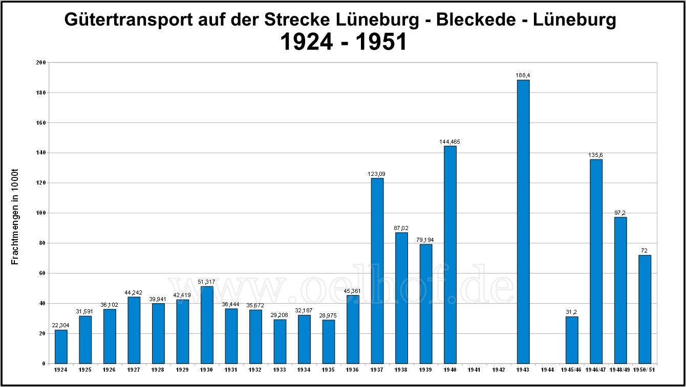 Der im Jahr 1917 geplante Güterbahnhof im Oelhof  wurde nicht gebaut (s. auch Landkarten).  Aussagen über geleistete Frachtmengen aus der Zeit vor 1924 sind nicht erhalten. Ab 1936 entstanden im Ölhof in Bleckede neue Rangiergleise, Verladeanlagen und Lokschuppen.