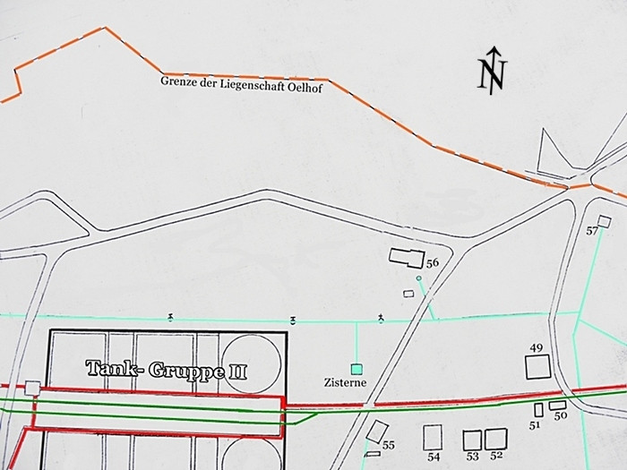 Das Gebäude Nr.57, Pumpenhaus und Wasserwerk, gehört, neben dem Lagerschuppen Nr. 49  und dem Trafogebäude Nr. 74 am Hafen, zu den ältesten, noch vollständig erhaltenen Gebäuden der ehemaligen Öltank-Anlage in in Bleckede. Erbaut wurde das Pumpenhaus im Jahre 1917/18 im nördlichen Teil der Öltank-Anlage. Der ursprünglich geplante Standort (orange markiert) für dieses Gebäude weicht vom tatsächlichen Standort um ca. 100m ab. Wie es zur Veränderung des Standortes kam ist ungeklärt. Die Tank-Gruppe I wurde in 1917/18 entsprechend dem Lageplan erstellt.
