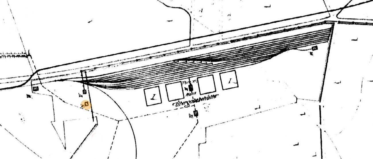 Bild 1: Gebäude Nr.57, ursprünglich geplanter Standort (orange markiert), Auszug aus dem Lageplan von 1917, Hauptstaatsarchiv Hannover, Hann 180, Lüneburg Acc. 3/015 Nr. 248.