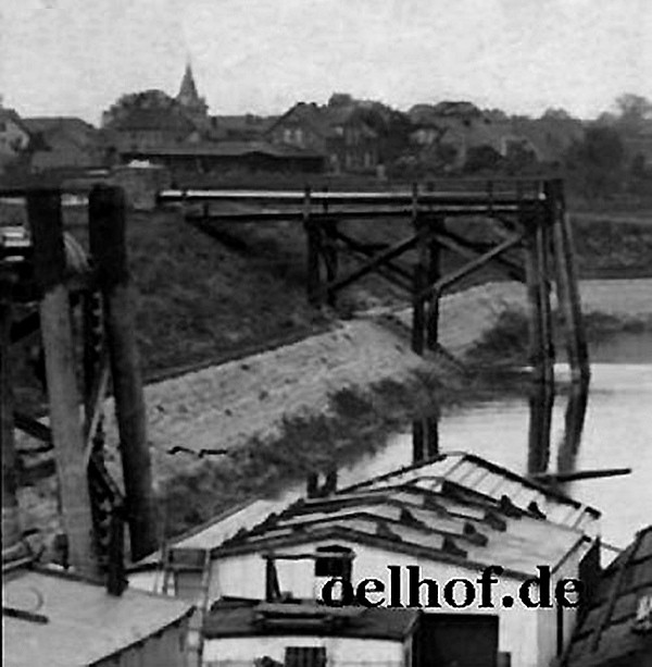 Im Bild 4 ist der „Rohrdeich“, angrenzend an die Anlage, gut zu erkennen. Dieser Deich hat keine Funktion im Sinne eines Strombauwerkes. Der Rohrdeich stellte eine Verbindung von der Verladeanlage zum bestehenden Deichsystem (Sanddeich) dar. Neben der Herstellung eines hochwassersicheren Fahrweges diente der Erdwall ausschließlich der Tarnung der Rohrleitungen zum Tanklager. Die Rohrleitungen verliefen im Rohrdeich, bzw. direkt neben dem Sanddeich im Deichfuß in Richtung Süden bis zum Schiedenitzweg (siehe auch Bild ganz oben im Kopf dieser Seite).